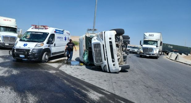 La volcadura ocurrió ayer en la rotonda que se localiza sobre la mencionada carretera en el crucero con el Segundo Anillo Periférico y el Bulevar Colosio Norponiente.