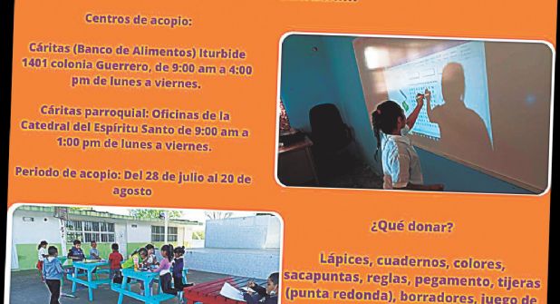 Bajo el lema “Con tu ayuda mi sueño se hará realidad”, Cáritas de Nuevo Laredo realiza colecta de útiles escolares para estudiantes de escasos recursos para que regresen al aula con todo lo necesario. Algunos de los útiles que pueden donar son lápices, cuadernos, colores, sacapuntas, pegamento, tijeras de punta redonda, borradores, juego de geometría, carpetas, hojas blancas, hojas de raya, hoja de colores, entre otros. La campaña inicia el 28 de julio, la entrega se tiene programada para el 20 de agosto a los menores con más necesidad en casa.