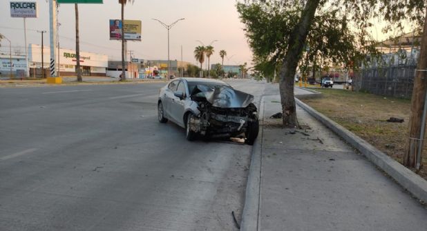Un vehículo fue abandonado por quien lo conducía después de que se estrelló contra un árbol ubicado en plena avenida Reforma, al sur de Nuevo Laredo.