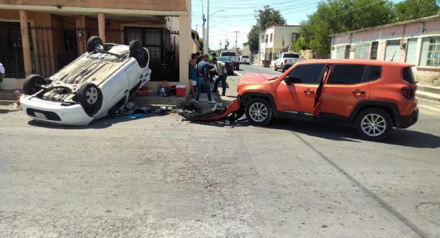 Aparatoso choque con volcadura se registró en calles de la colonia Viveros, luego de que el conductor de un automóvil compacto no respetó la señal de alto y fue impactado por la conductora de una camioneta que tenía vía libre.