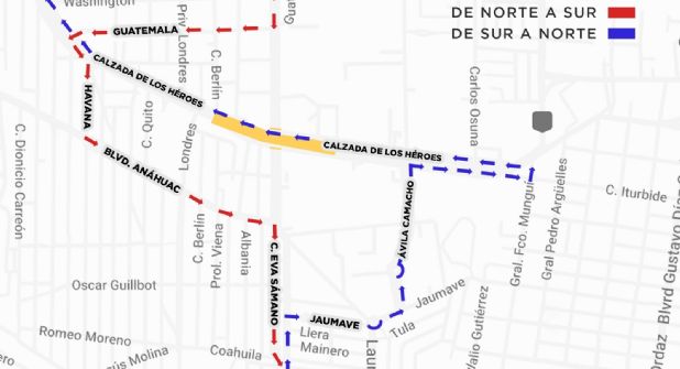 Al llegar, girarán al oriente para llegar a Francisco Murguía y retornar a Calzada de los Héroes por la vía lateral en dirección al poniente hasta llegar nuevamente a Eva Sámano.