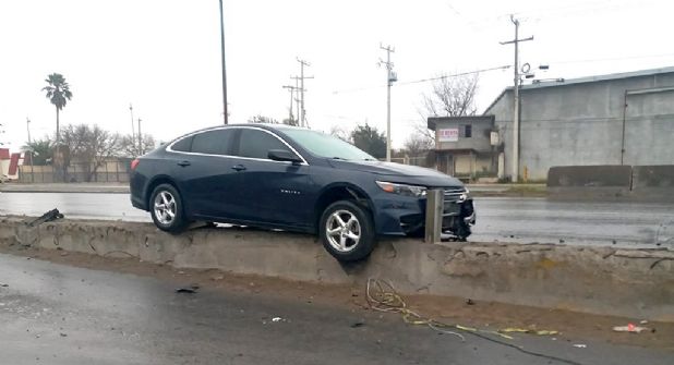 Por no ir atento al volante, el conductor de un automóvil Chevrolet Malibu 2016 terminó trepándose a un camellón de concreto en la Carretera Nacional de Nuevo Laredo, causando daños en los cuatro rieles de contención.