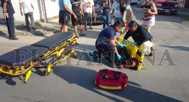 El accidente se registró la mañana del lunes en las calles de Bolívar y Esteban Baca Calderón en la colonia Matamoros. Tirada en medio de la calle quedó la mujer identificada como Yanet Lucía, de 43 años, quien sufrió un golpe en la cabeza, quejándose además de fuertes dolores en su cadera.
