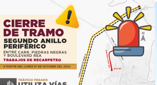 Debido a trabajos de recarpeteo, a partir del lunes 21 de octubre, cerrarán la vialidad en un tramo del segundo Anillo Periférico, entre Bulevar Rea y Carretera a Piedras Negras.