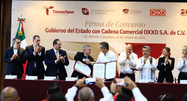 El gobernador Américo Villarreal Anaya presidió la firma del convenio de colaboración con la Cadena Comercial Oxxo, a fin de reforzar la seguridad y mejorar la respuesta ante situaciones de emergencia, mediante la implementación de acciones clave con el propósito de prevenir el delito a través de una mayor vigilancia, el uso de tecnología y la coordinación eficaz con las instituciones de seguridad pública.
