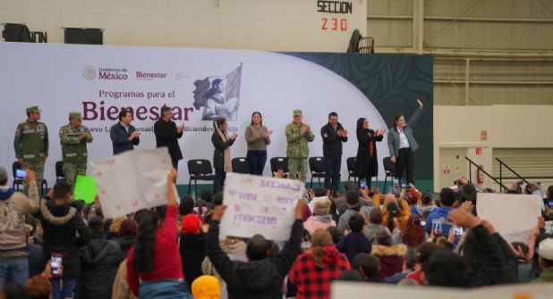 En el Polyforum La Fe, la presidenta fue recibida con muestras de apoyo por parte de los neolaredenses, quienes destacaron la importancia de su presencia en la frontera.