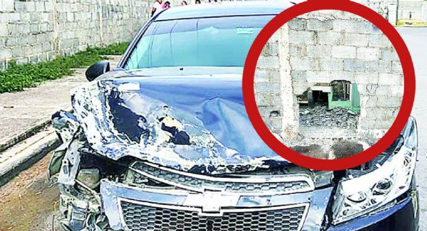 Sin poder enderezar el rumbo, se desvió a la izquierda y chocó contra la barda de concreto del convento, causando un “boquetón” en la barda de concreto.