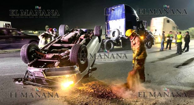 Un aparatoso accidente ocurrió frente a la empresa transportista FEMA, donde una camioneta Chevrolet con placas PX-3785-A de Nuevo León terminó volcada tras impactar con un tractocamión de la empresa M&S Trucking.