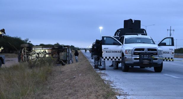 Nuevo Laredo, Tamaulipas, 03 de diciembre de 2024 .— Un vehículo blindado SandCat de la Guardia Nacional, con número económico 16392, volcó esta madrugada en el Libramiento Mex II, a la altura del Puente Mocho, en los carriles de exportación del Puente Internacional III “Del Comercio Mundial”. El accidente se registró cuando el conductor, un elemento militar, perdió el control del vehículo al circular a exceso de velocidad, saliendo de la carpeta asfáltica y volcando sobre su costado derecho.