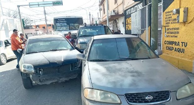 Seis vehículos, entre ellos dos camiones urbanos, se vieron involucrados en un aparatoso accidente ocurrido en la colonia Guerrero, provocado por una mujer que cambió de carril sin cuidado.