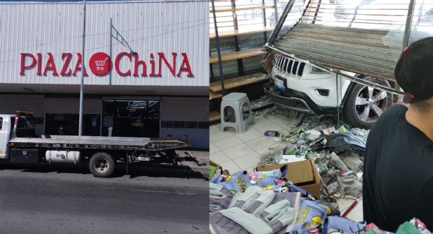 Personal de Protección Civil y Bomberos acudieron de inmediato a la Plaza China y tras hacer la inspección correspondiente, reportaron a su central que el propietario de la negociación había chocado contra las cortinas de su propio negocio y solo había cuantiosos daños materiales.