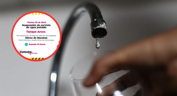 Debido a los trabajos programados de la Comisión Municipal de Agua Potable y Alcantarillado, Comapa, esta realizará las labores de reparación a una tubería de 24 pulgadas, por lo que las colonias abastecidas por el Tanque Arcos, sufrirán por la falta de agua en sus hogares durante un tiempo máximo estimado de 14 horas.