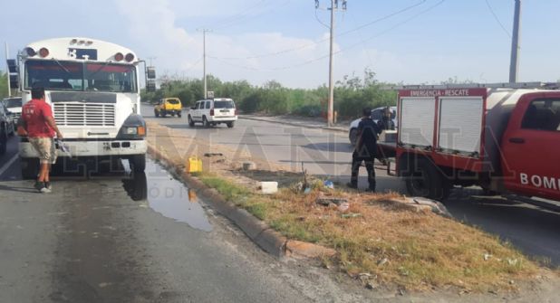 El incidente se registró el lunes por la tarde sobre el Bulevar Carlos Canseco y el entronque con el Segundo Anillo Periférico al norponiente de Nuevo Laredo, donde el motor del vetusto camión empezó a incendiarse.