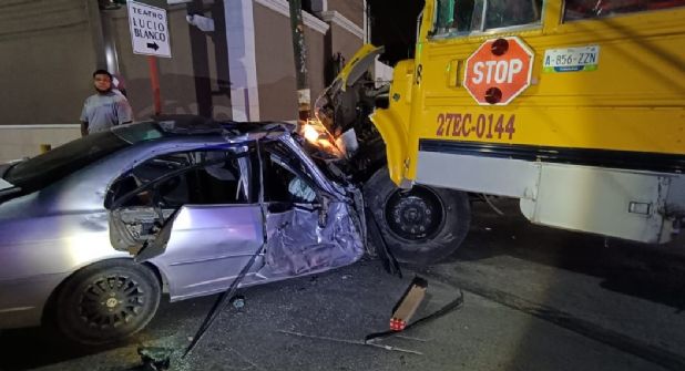Un chofer de camión de los amarillos se llevó de encuentro un automóvil compacto, cuyo conductor en estado de ebriedad, ignoró la luz roja del semáforo.