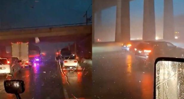 En las imágenes captadas por Torbellino se aprecia que está en una carretera. Los vehículos se detienen, pues empieza a llover y caer granizo. Los vientos empiezan con más fuerza y es justo cuando al girar el celular se nota el paso del tornado.