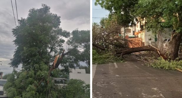 Protección Civil compartió en un comunicado que los vientos alcanzaron los 100 km/h, causando grandes estragos como árboles y postes caídos.