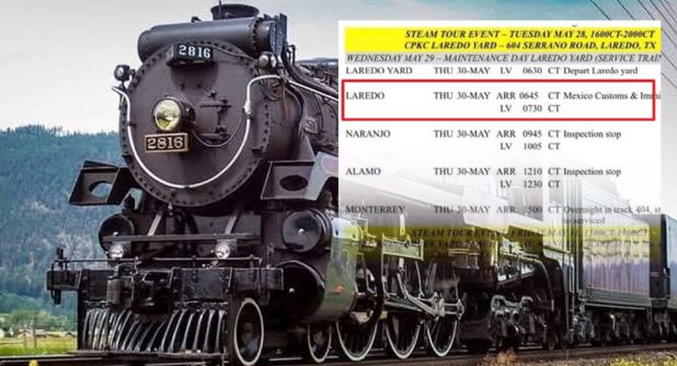 El itinerario del tren de vapor Empress 2816 continuará mañana, 30 de mayo, cruzando la frontera hacia México. La locomotora pasará por Nuevo Laredo en su camino hacia Monterrey, aunque no se detendrá para exhibición en esta ciudad.