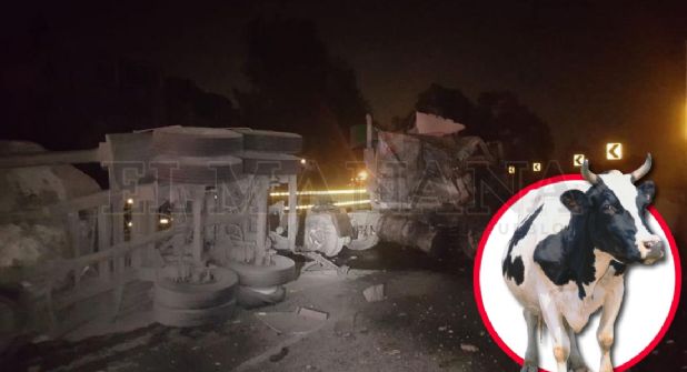 Igualmente, el personal en el lugar del accidente encontró a la vaca muerta a un lado de la carretera, la cual falleció en el choque contra el trailero.
