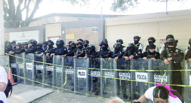 Momentos antes de que concluyera el cómputo y se dieran a conocer los resultados, la tensión al exterior del Ietam era de tal grado que fue necesario replegar a un contingente de elementos de la Guardia Estatal y de la Guardia Nacional con escudos antimotines.