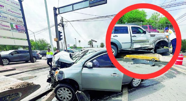 Un fuerte accidente entre los conductores de una camioneta y un automóvil dejó como resultado cuantiosos daños materiales, tanto en vehículos involucrados como en parte de las instalaciones del Centro de Atención a Solicitantes (CAS) del Consulado de Estados Unidos.