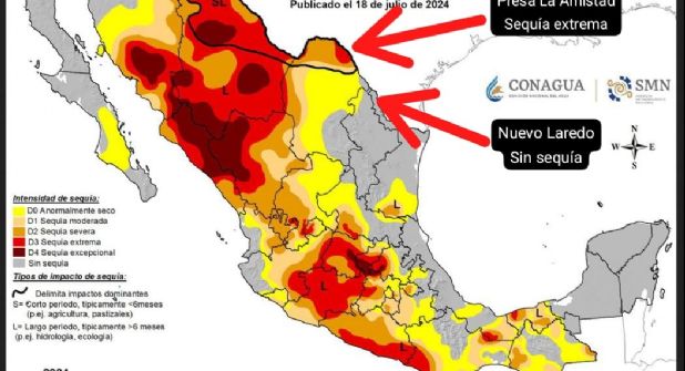 Mientras que el suelo neolaredense se ha visto beneficiado por las recientes lluvias para estar libre de sequía, el área en donde se encuentra la presa La Amistad que surte de agua a esta frontera, se clasifica en estatus de sequía extrema, mientras que el embalse está en niveles críticos, con apenas un 19 por ciento de su capacidad, de acuerdo con estadísticas de la Comisión Internacional de Límites y Aguas (CILA).