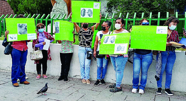 “Por los que estamos, en memoria por los que ya no están, por todo el maltrato que nos dan, recortes de horario en nuestras sesiones, es por lo que hoy estamos aquí exigiendo una atención digna”, expresó San Juana Elizabeth Martínez, quien ayer fue dada de alta del IMSS tras 13 días de haber sido internada por infección en la sangre a causa de que el catéter se le contaminó mientras recibía su hemodiálisis en esta clínica.