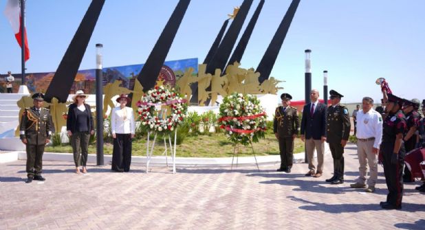 El Comandante José Antonio Hernández Macías, junto con la presidenta municipal Carmen Lilia Canturosas, se ubicaron frente al Monumento a los Niños Héroes construido dentro del cuartel, sobre el Bulevar Colosio, para colocar una ofrenda floral.