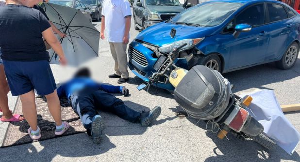 Muy lastimado quedó un motociclista al estrellarse contra un automóvil, cuya conductora invadió la vía preferencial con el frente de su vehículo en calles de la Colonia Los Fresnos, al sur de Nuevo Laredo.