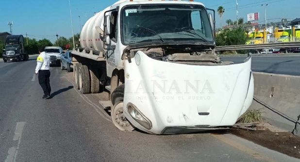 En Nuevo Laredo, ileso de milagro salió el chofer de un camión-pipa de una empresa sanitaria, ya que, al ir circulando por la Carretera Aeropuerto, a la altura de Egoba, se da cuenta de que había una larga fila de vehículos y al tratar de frenar, se descontrola, impactándose contra los muros protectores y la parte trasera de un camión recolector de basura.