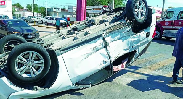 Volcada sobre la avenida César López de Lara quedó una camioneta Chevrolet Equinox, cuya conductora salió viva de milagro y sólo quedó algunos rasguños en el cuerpo, mientras que el chofer de un camión tipo pluma con quien chocó, también salió ileso.