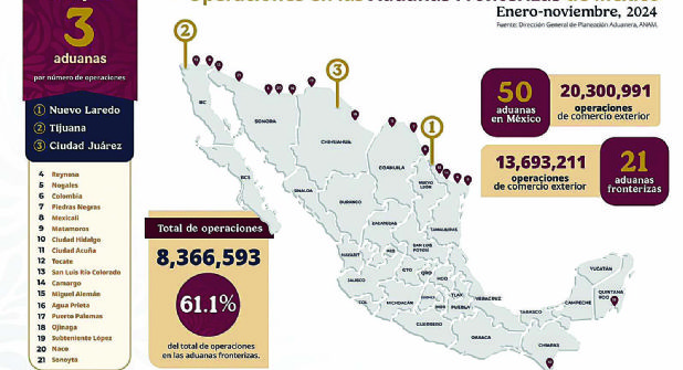 La aduana de Nuevo Laredo se colocó durante los últimos meses del 2024 como el principal puerto fronterizo del comercio exterior, seguido de Tijuana y Ciudad Juárez, al registrar 8 millones 366 mil 593 operaciones, es decir, 61.1 por ciento del total de las -21- aduanas fronterizas por donde se realizaron 13 millones 693 mil 211 cruces de mercancías.