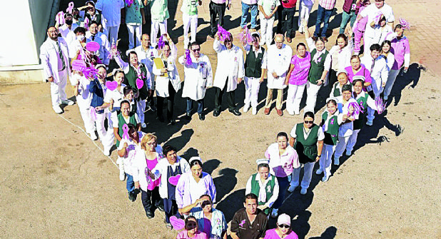Personal médico y sanitario del Hospital General IMSS-Bienestar con prendas alusivas al color rosa, realizó el Lazo Rosa Humano en memoria de las personas que han perdido su vida por el cáncer de mama y por aquellas que siguen en “guerra” para salvar su vida contra esta causa.