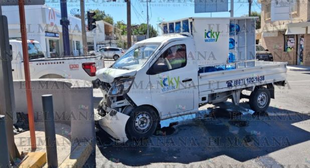 Tremendo choque se registró en el crucero de la avenida Degollado y Venustiano Carranza entre un auto Nissan Altima y un camión repartidor de agua purificada. Del impacto, el chofer del vehículo comercial terminó estampado contra el muro de concreto de una de las esquinas y, milagrosamente, salió sin lesiones.