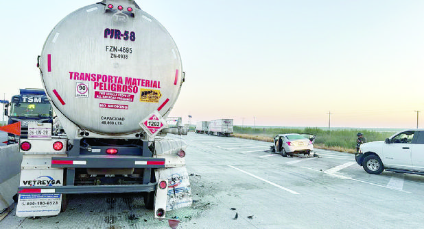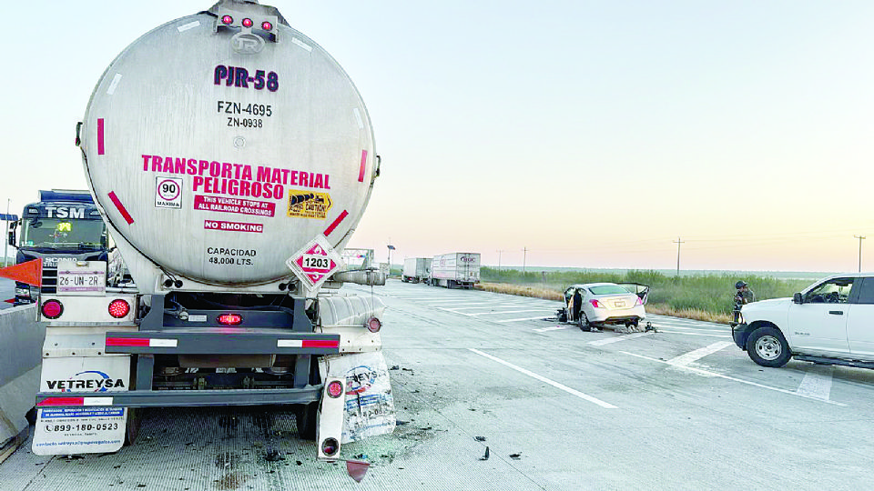En el kilómetro 192 de la autopista en dirección a Nuevo Laredo se registró ayer un aparatoso accidente en el que una unidad de seguridad privada se impactó de forma brutal contra un camión pipa, dejando a los tripulantes del primer vehículo gravemente heridos.