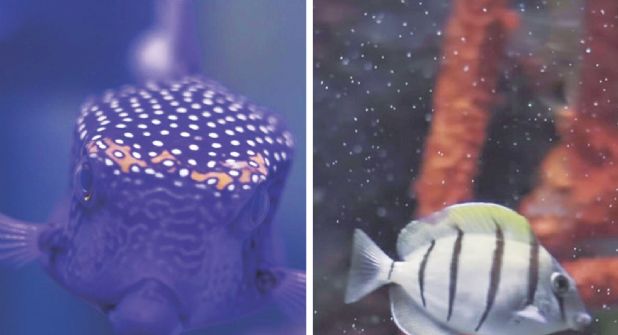 También se encuentra el pez cirujano bahía y el pez cofre azul, que tienen una variedad de colores diferentes, y se destacan por un patrón hexagonal a modo de nido de abeja en su piel o esqueleto.