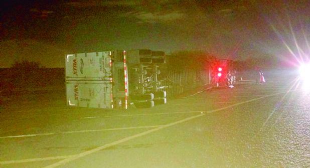 Un operador de tráiler y su acompañante resultaron lesionados luego de que la unidad de carga en que viajaban volcara en el Libramiento Mex II, al tomar el Radial 3 y ser vencido por la carga que transportaba.