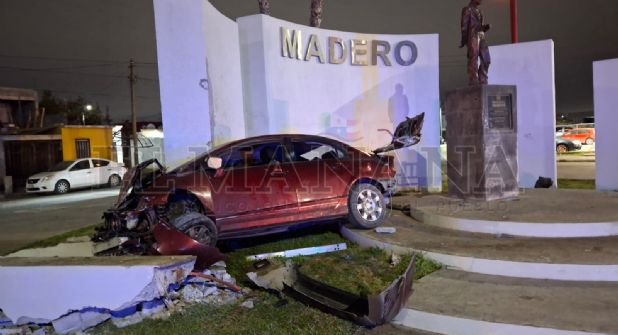 En la curva frente al edificio de Chedraui, la conductora se descontroló, trepándose a la jardinera para estrellarse contra la plazoleta del monumento. Se pudo observar que el carro pasó rozando el monumento a don Francisco I. Madero y poco falto para que se lo llevara de encuentro.