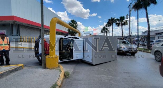 Un camioncito quedó volcado en una de las entradas al estacionamiento de la tienda Soriana La Fe, debido a que su chofer no se dio cuenta de la baja altura de unos tubos de contención y la caja metálica pego con ellos, produciéndose el accidente.