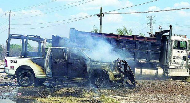 Un camión de volteo, cuyo conductor huyó, se llevó de encuentran a dos patrullas de la Guardia Estatal que circulaban por la Carretera a Anáhuac. Del impactó una de las unidades policiacas estalló en llamas.