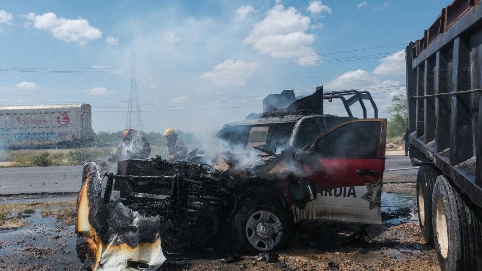 Elementos de la Guardia Estatal causaron un aparatoso accidente en la carretera a Ciudad Anáhuac al perder el control de una patrulla, que se estrelló de frente contra un camión de volteo. Debido al impacto, la patrulla se incendió.