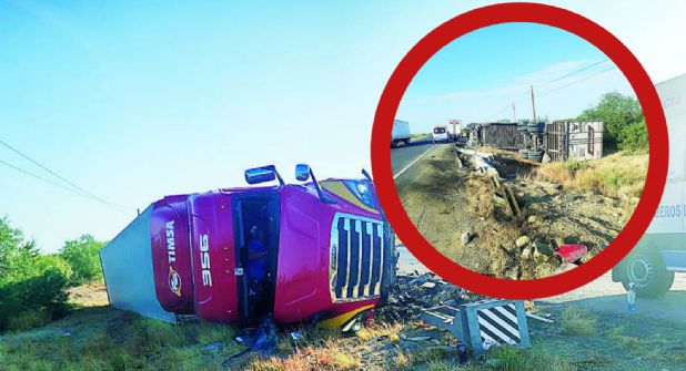 Un operador de tráiler resultó ileso tras volcar su vehículo de carga en el Kilómetro 171 de la Carretera Nuevo Laredo-Monterrey, luego de quedarse dormido al volante.