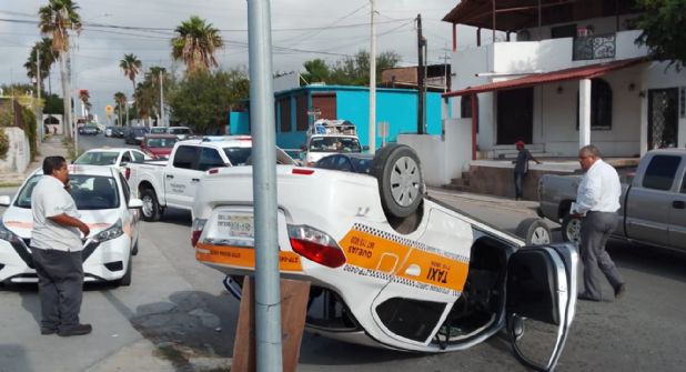 Un taxista y dos personas que viajaban con él resultaron lesionados, luego de que volcaron tras ser chocados por un automovilista que no respetó la señal de alto, en calles del sector poniente de Nuevo Laredo.