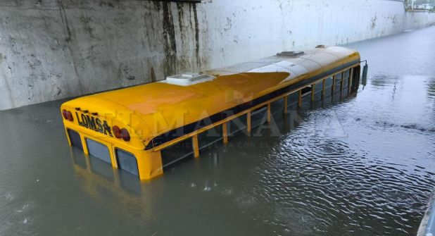 Un transporte de personal “Lomsa” quedó atrapado debajo del paso de desnivel de la calle Anáhuac en Nuevo Laredo. El camión llevaba a un grupo de pasajeros que tuvieron prácticamente que nadar para ponerse en un lugar seguro fuera de la unidad.