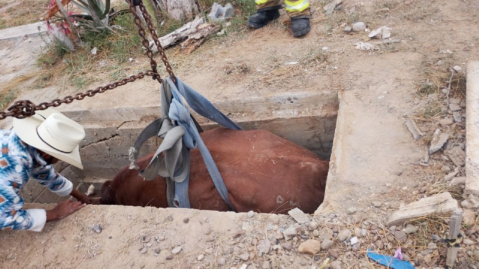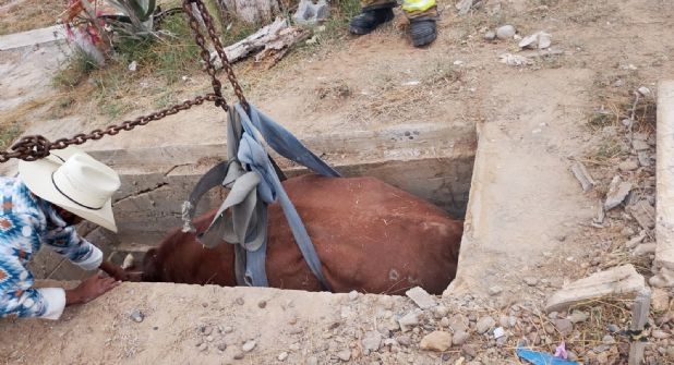 Personal del cuerpo de bomberos llevaron a cabo el rescate de una vaca que cayó en una fosa del Panteón Municipal del Kilómetro 10 al sur de la ciudad.