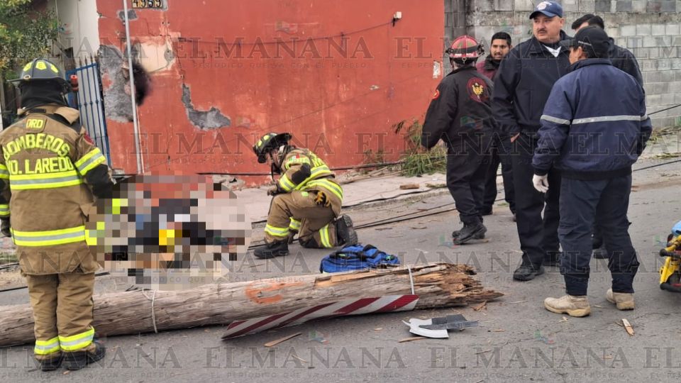 Bomberos fueron captados removiendo con sumo cuidado los cables del poste derribado, a fin de que los paramédicos pudieran acercarse al trabajador, quien permanecía tirado en la banqueta.