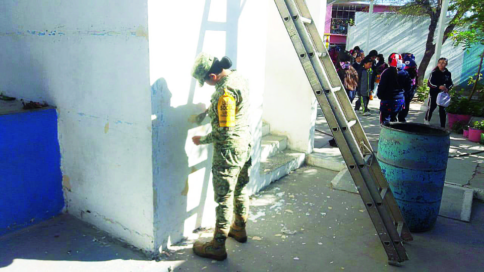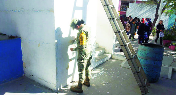 Sin dejar de portar con gallardía su uniforme, los soldados tomaron brochas, pintura y escalera para renovar la imagen del edificio que es ocupado por ambas escuelas tanto en el turno matutino como vespertino.