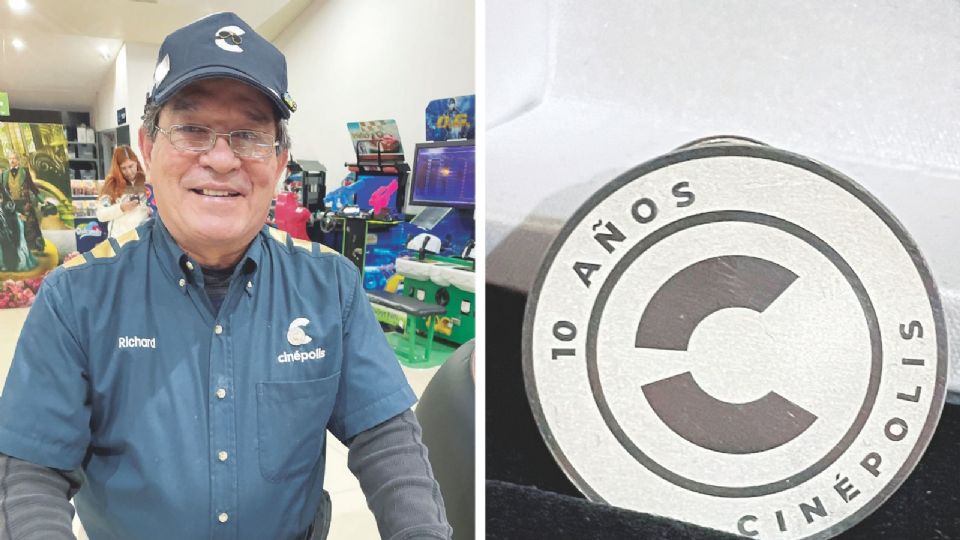 Muy contento de haber cumplido 10 años como trabajador en el cine del centro comercial Paseo Reforma, Ricardo Trujillo, mejor conocido como don Richard, porta la insignia de la cadena de cines que le otorgó por su décimo aniversario laboral.