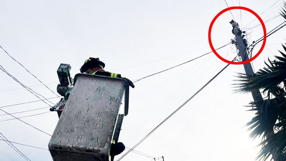 En una acción coordinada que movilizó a los cuerpos de emergencia y servicios municipales, un gatito conocido como "Chómpiras" fue rescatado tras quedar atrapado en la parte alta de un poste de madera en la colonia Colinas del Sur.