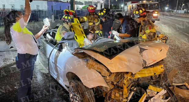 Un aparatoso accidente registrado sobre la Carretera Aeropuerto dejó como saldo un menor de edad atrapado y herido entre los fierros retorcidos del vehículo que conducía y otros dos jóvenes con golpes, tras estrellarse de frente contra la base de un enorme señalamiento metálico.