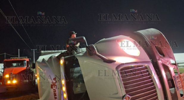 Vivo de milagro salió un trailero que, en la curva de la Rotonda del Conejo, el peso de la carga que transportaba se le fue de lado, y su camión se volcó con todo y contenedor.